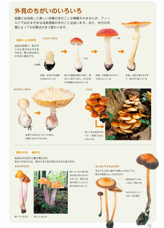 成長段階によって、色や形が変化するきのこもある。きのこが1つ見つかれば、まわりに同じきのこが生えている可能性も高い。できるだけ状態のちがう個体を複数確認するようにしよう。また、きのこは湿っているときと、乾燥しているときでは、色や粘性の状態などが、ちがっていることもある。